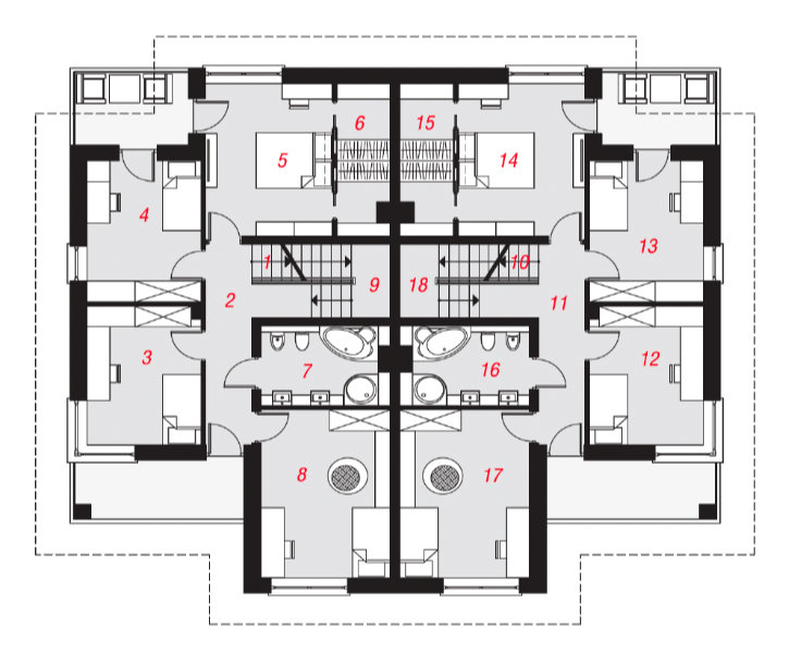 Nowoczesnym detalem są oszklone balustrady, które wraz z licznymi przeszkleniami dodają wyjątkowej elegancji. W budynku przewidziano dwa osobne mieszkania po 162,14 m2 plus poddasze 60 m2 i każde z nich dysponuje jednostanowiskowym garażem (drugie stanowisko zewnętrzne na terenie zamkniętym domu), przynależna działka do każdego z mieszkań po 525 m2/584 m2. Mieszkania posiadają niezależne wejścia główne, ogród oddzielony ogrodzeniem metalowym z nasadzeniami. Strefy wejściowe zostały zadaszone poprzez zaprojektowany na piętrze balkon. W podobny sposób został osłonięty duży taras od strony ogrodu
